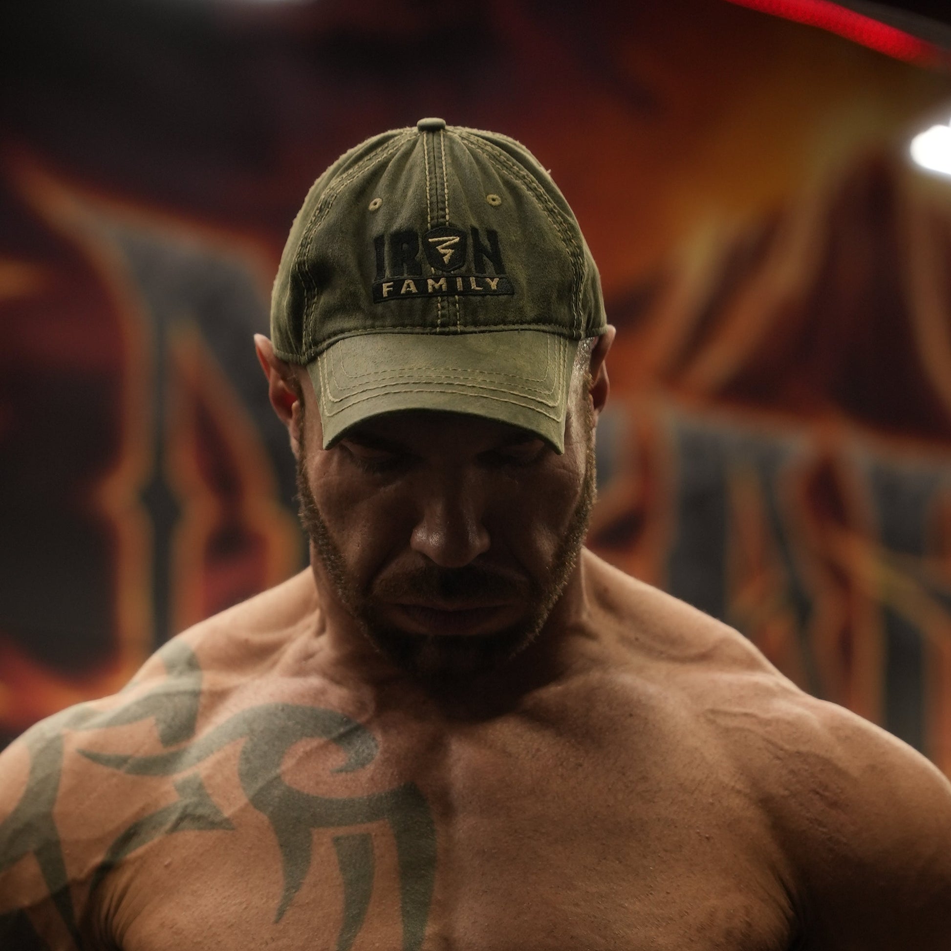 This cap has an oiled distressed leather look and is embroidered with IRON FAMILY to represent your commitment to supporting the gym and encouraging each other.